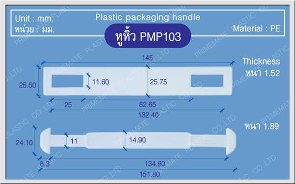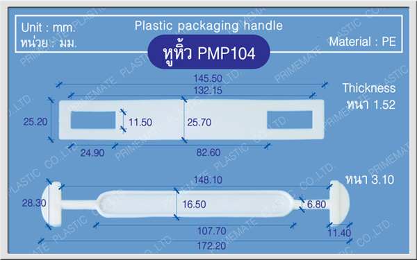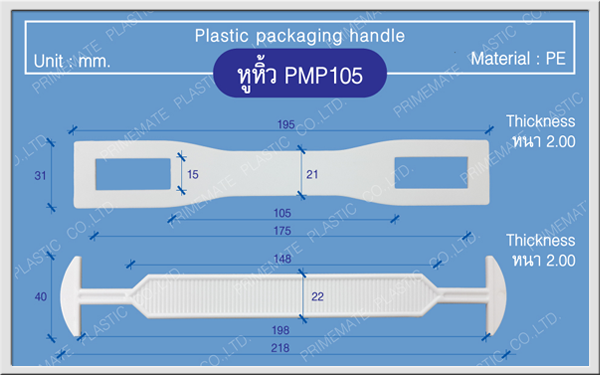 บริษัทฯ เป็นผู้ผลิตและจำหน่ายหูหิ้วพลาสติกสำหรับบรรจุภัณฑ์ มีให้เลือกหลากรุ่นหลายขนาด ด้วยคุณสมบัติที่ดีเยี่ยมและราคาที่น่าพึงพอใจ หูหิ้วของเราจึงได้รับการเลือกใช้จากลูกค้าจำนวนมากทั้งในและต่างประเทศ